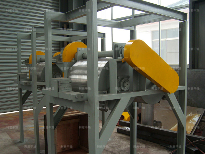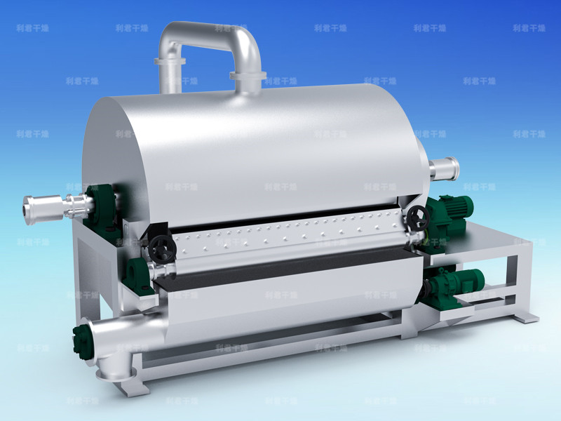 啟動電機,主滾筒動運轉(zhuǎn)平穩(wěn),溫度升高后加入物料后調(diào)整電機轉(zhuǎn)速及物料在滾筒上薄膜均勻程度來控制物料最終含水量。